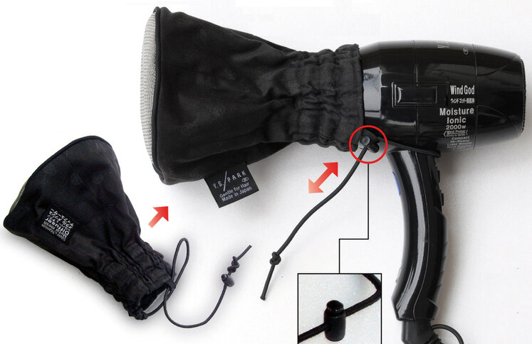 Utilisation: Placer le diffuseur chaussette sur votre sèche-cheveux. adaptable, ajuster le cordon à l’aide du bouton pressoir, puis passer le second cordon au niveau du manche du sèche -cheveux pour maintenir le diffuseur.